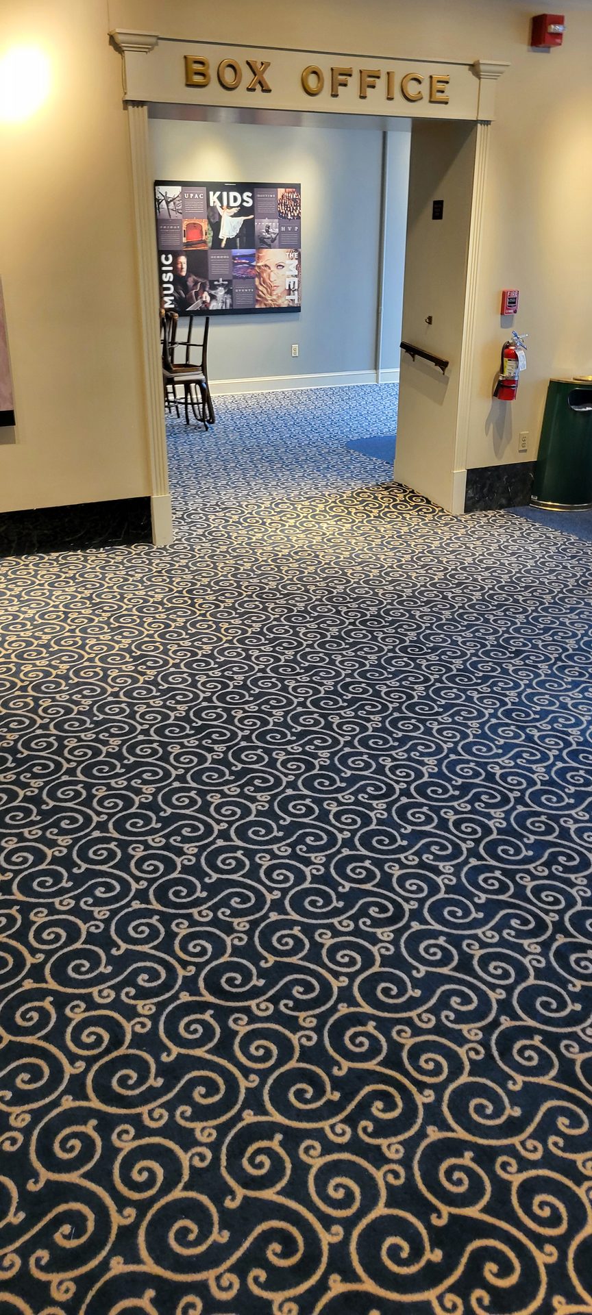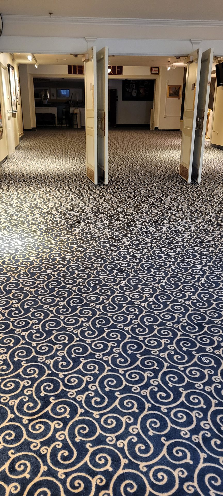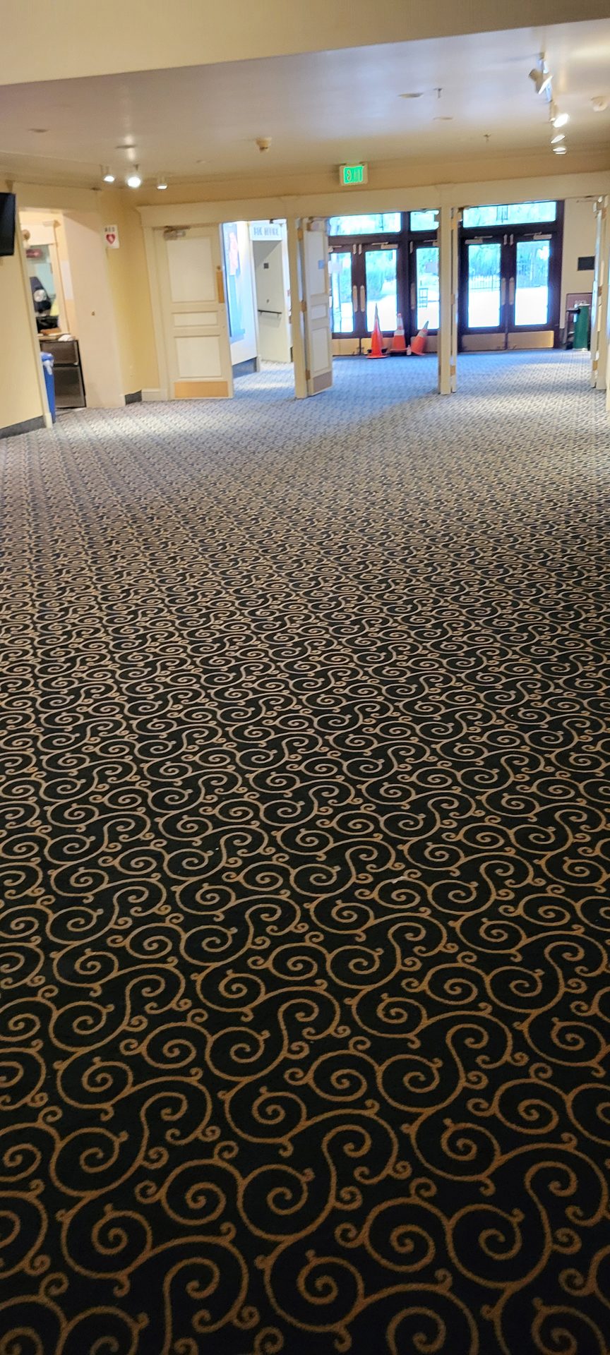 Challenges: The lobby area had several types of substrate and was extremely bumpy. A self-leveler was required. The pour ended up leaving a “half pipe” curved floor with an inch lower middle portion and both edges to the sides an inch higher. The width of the lobby area was 30-foot wide, so it wasn't noticeable to walk on. The carpet had a 2 1/2-inch skew which made the top-dyed pattern additionally difficult. One cross seam had a difference of 1 1/2 inches on one side of a double doorway to 4 1/2 inches six feet away. I needed to stretch the carpet and seam the edges with KG double stick seam tape.