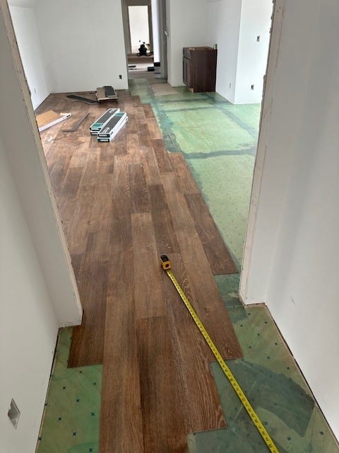 Challenges: It was 3,000 square feet of flooring, a pattern in the dining room and a medallion in the foyer. Underlayment was installed as well throughout the house.