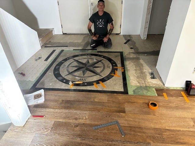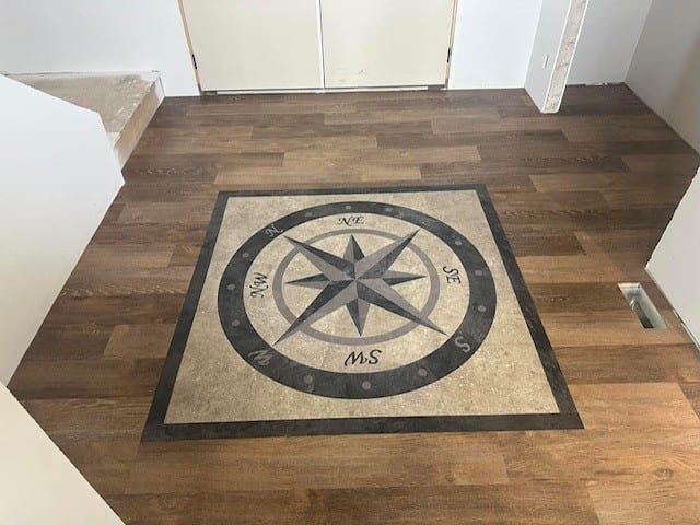 Unique Features: The medallion came in multiple pieces, which meant we had to put it together in the home. Additionally, the customer requested that the compass face due North. The pattern in the dining room didn't work in the real world, but the installers worked with the homeowner to have the project designed on site.